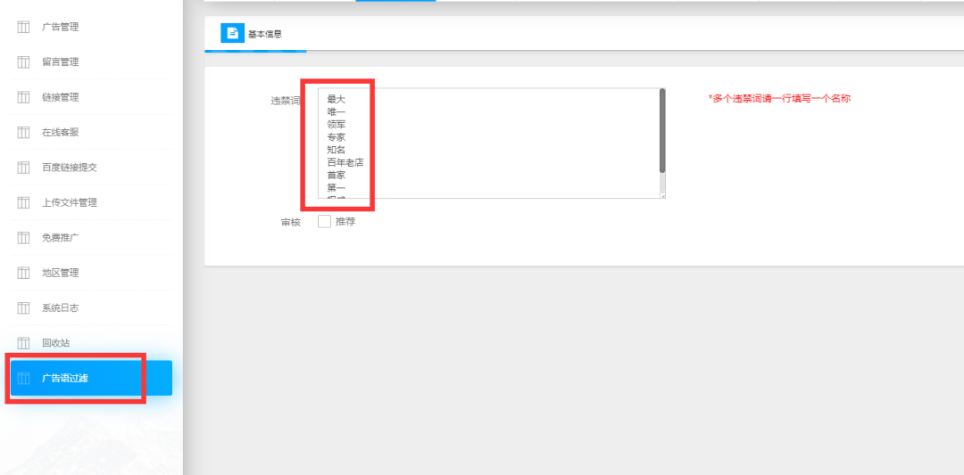 廣告法規定越來越嚴格,廣告詞成了企業的不敢碰觸的“炸彈”。對此,此次“萬家燈火CMS系統”的升級,可在編輯框中自定義自己領域中的違禁詞,讓網站遠離“危險”*。