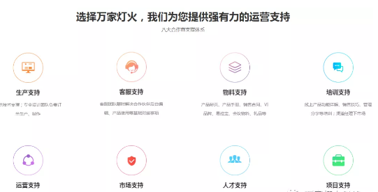 三:總部建立了一整套*的代理幫扶流程,包括生產支持,客服支持,物料支持,培訓支持,運營支持,市場支持,人才支持,項目支持八大支持政策。