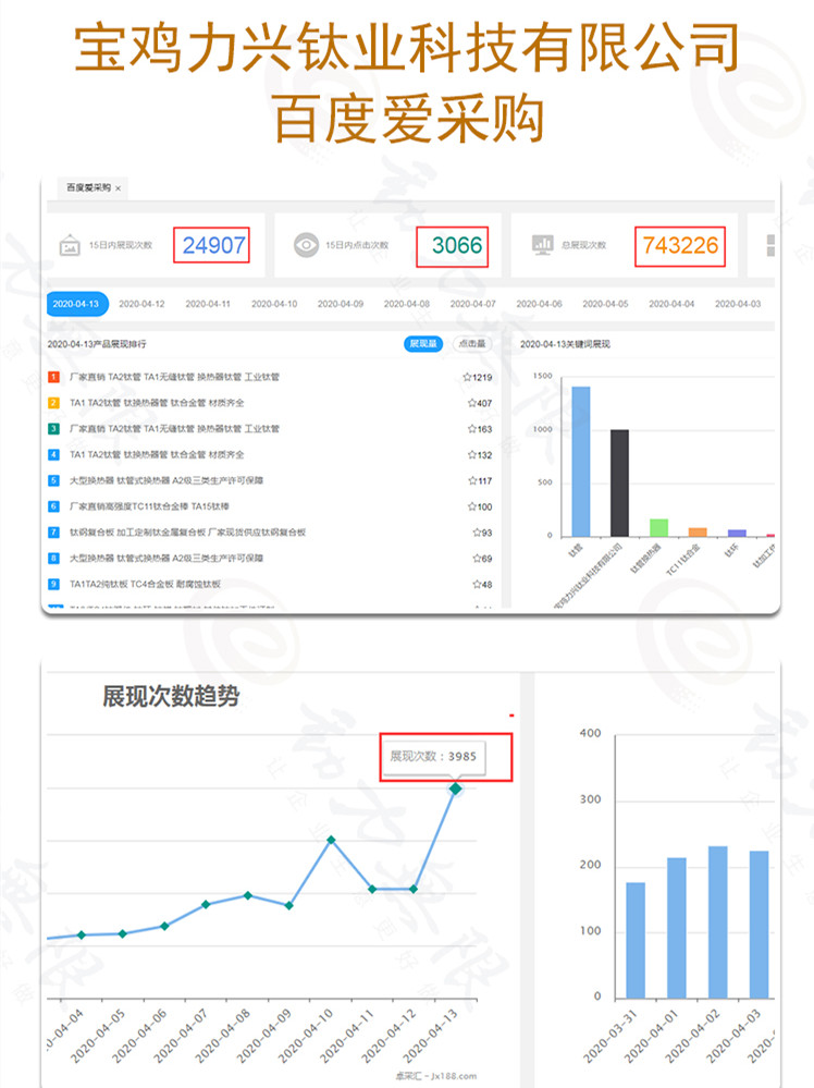 寶雞力興鈦業(yè)科技有限公司,這一個(gè)月以來,百度愛采購的總展現(xiàn)次數(shù)高達(dá)743226次,點(diǎn)擊量提高的同時(shí),詢盤量也得到明顯增加,更多意向客戶成交促進(jìn)受益。