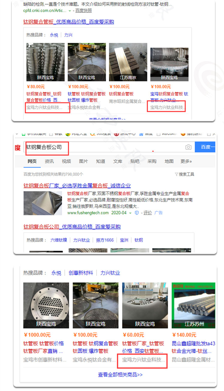 15天內(nèi),曝光度為24907次,點(diǎn)擊數(shù)達(dá)到3066次;在關(guān)鍵詞搜索中,寶雞力興鈦業(yè)科技有限公司的“鈦合金梯子”、“TA2工業(yè)鈦板”、“鈦鋼復(fù)合管板”、“大型鈦換熱器”等,排在*位。