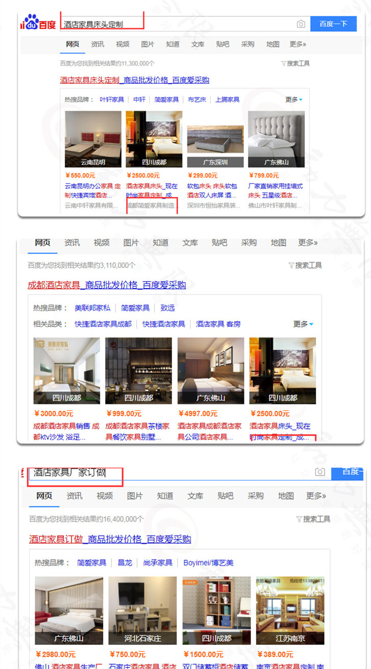 在關(guān)鍵詞搜索中,成都簡(jiǎn)愛家居制造有限公司的“酒店家居床頭定制”,排在第二位;“成都酒店家具”排在第四位。