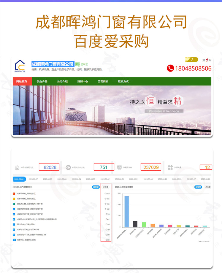 成都暉鴻門窗有限公司,這一個(gè)月以來,百度愛采購的總展現(xiàn)次數(shù)為237029次,近15天內(nèi),曝光度高達(dá)82028次,點(diǎn)擊數(shù)達(dá)到751次。