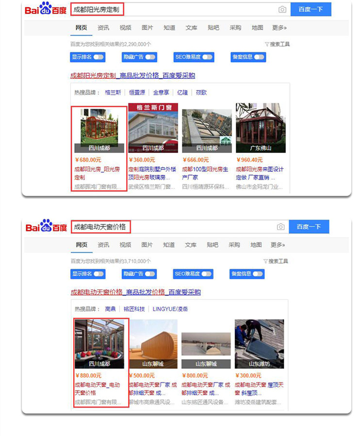 在關(guān)鍵詞搜索中,成都暉鴻門窗有限公司的“成都陽光房定制”、“成都電動(dòng)天窗價(jià)格”,排在*位;“成都斷橋鋁門窗”排在第二位;“成都別墅銅門”、“成都鋁包木門窗排在第三名”。