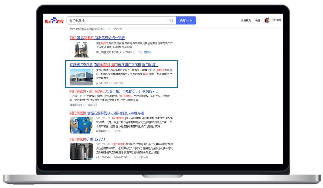 匯雅通官網上線不到1個月,成功被搜索引擎收錄,而且關鍵詞:荊門制氮機、宜昌螺桿空壓機、宜昌干燥機,均在百度首頁展示。