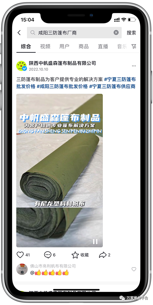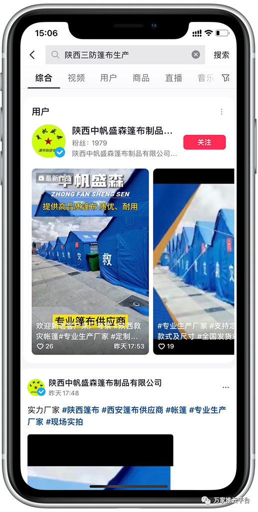 >>>視頻:策劃剪輯發布多條視頻,咸陽三防篷布廠商、陜西三防篷布生產等關鍵詞均在抖音搜索前列展現。